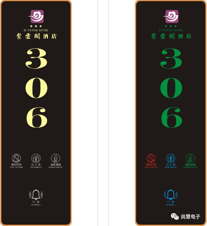 尚慧電子雙色門牌專為酒店精心設計的“五合一”房號門鈴系統、“請即清理”極具人性化設計,讓客房內外溝通隨心所欲,體貼的“請勿打擾”功能給客房主人一個寧靜舒適的私人空間,充分體現產品的智能化和科技感,酒店給客房主人提供的清晰、簡單的人性化服務,使客人輕松擁有屬于自己的私密空間,入住前暖黃光,入住后綠光,房態一目了然。